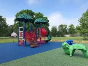 No Fault Safety Surface was installed for two playground areas in vivid colors of blue and green. If you look closely, you’ll see “Calvin the Caterpillar” (in green) and “Harry the Hippo” (in blue)! These two characters are quite popular with the children!