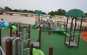 The total project was around 6,200 square feet and featured a bright green poured-in-place surface. Having the full rubber surfacing was an important part of making this playground accessible and welcoming to all the students. The No Fault Safety Surface is perfect for this inclusive playground since it’s slip-resistant, safe, and allows greater accessibility for wheelchairs and other mobility devices. The beautiful green color of the surfacing really complements the play equipment that was chosen. Beauty and safety combine to make a unique and attractive play space!